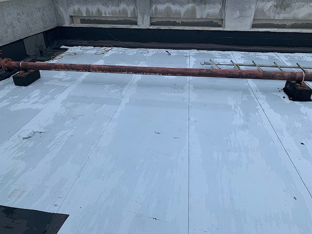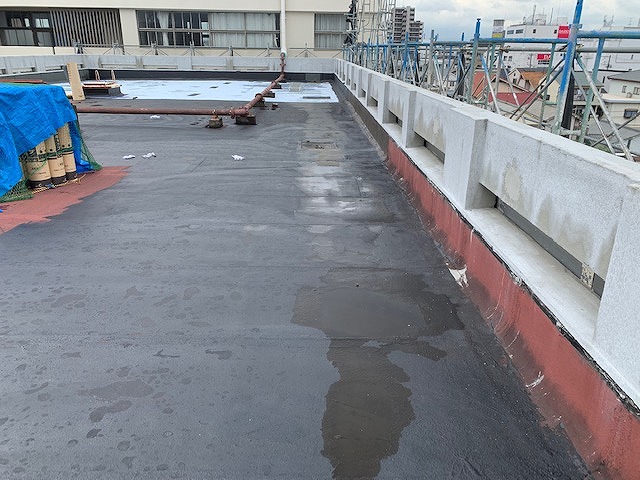 改質アスファルトシート防水 2024年5月15日 改質アスファルトシート防水 施工前 施工後 立がりシート撤去後 平場水溜まり部補修御 アスファルトルーフィング二層貼り施工 仕上げトップコート高耐久高反射仕様 施工画像